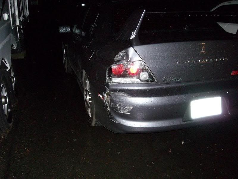 Ok so last night i was at the sonics game, and im walkin back to my car and come to find out that during the game some as*hole who obviously can't drive worth a sh*it completly smashed the drivers side quarter panel of my car and jus drove off, bumper was torn apart, tail light broken, spoiler smashed up.....it's bad! The worst part is that i had paid 20 bucks to park in that stupid parking lot for 3 hours and this ishhh happens. called the cops and filed a report, thank god for insurance! lol
