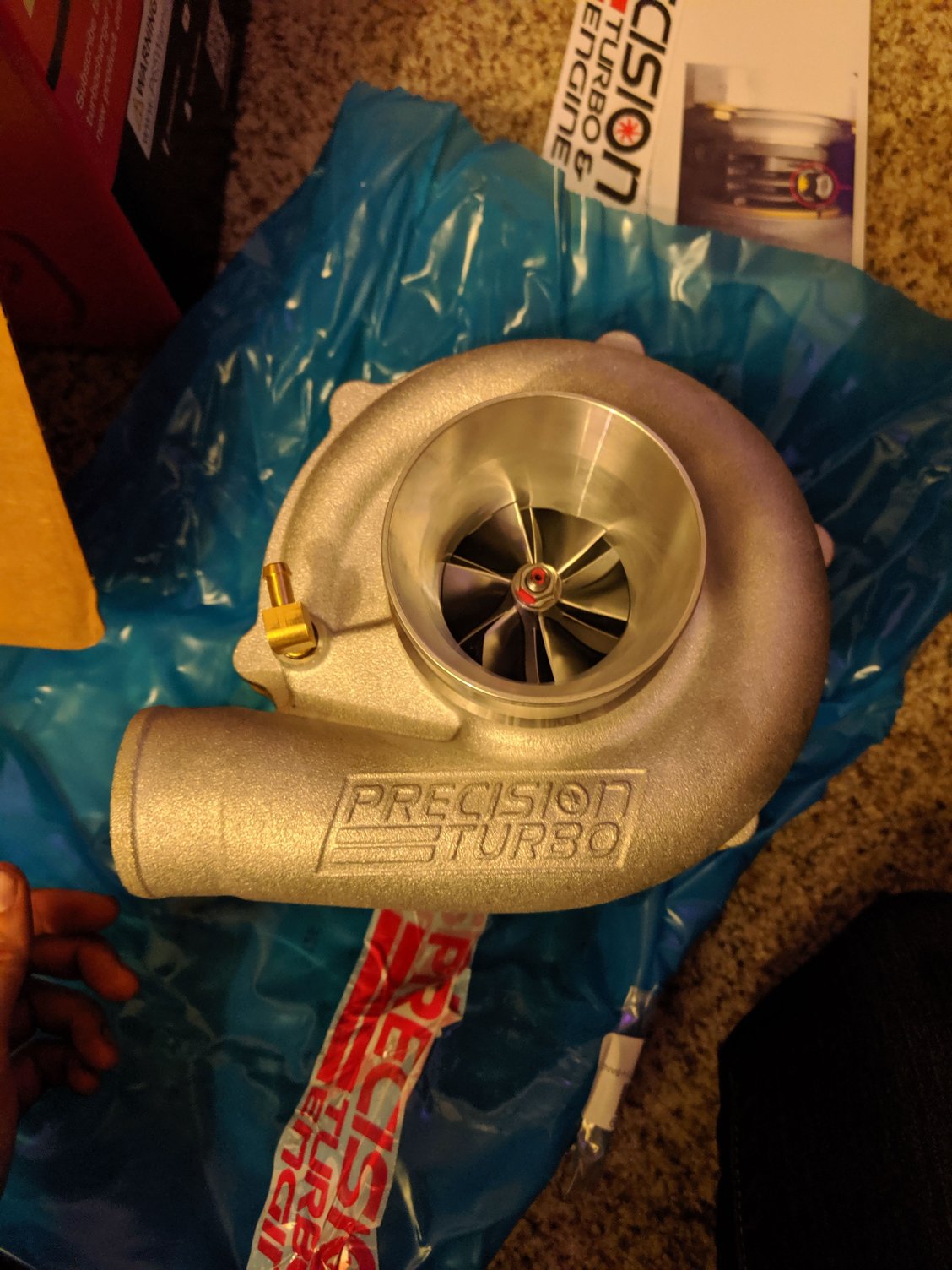 PTE 5858 turbo; ball bearing, 3" inlet, 2" outlet, .82 A/R, all v-band. I. AM. STOKED.