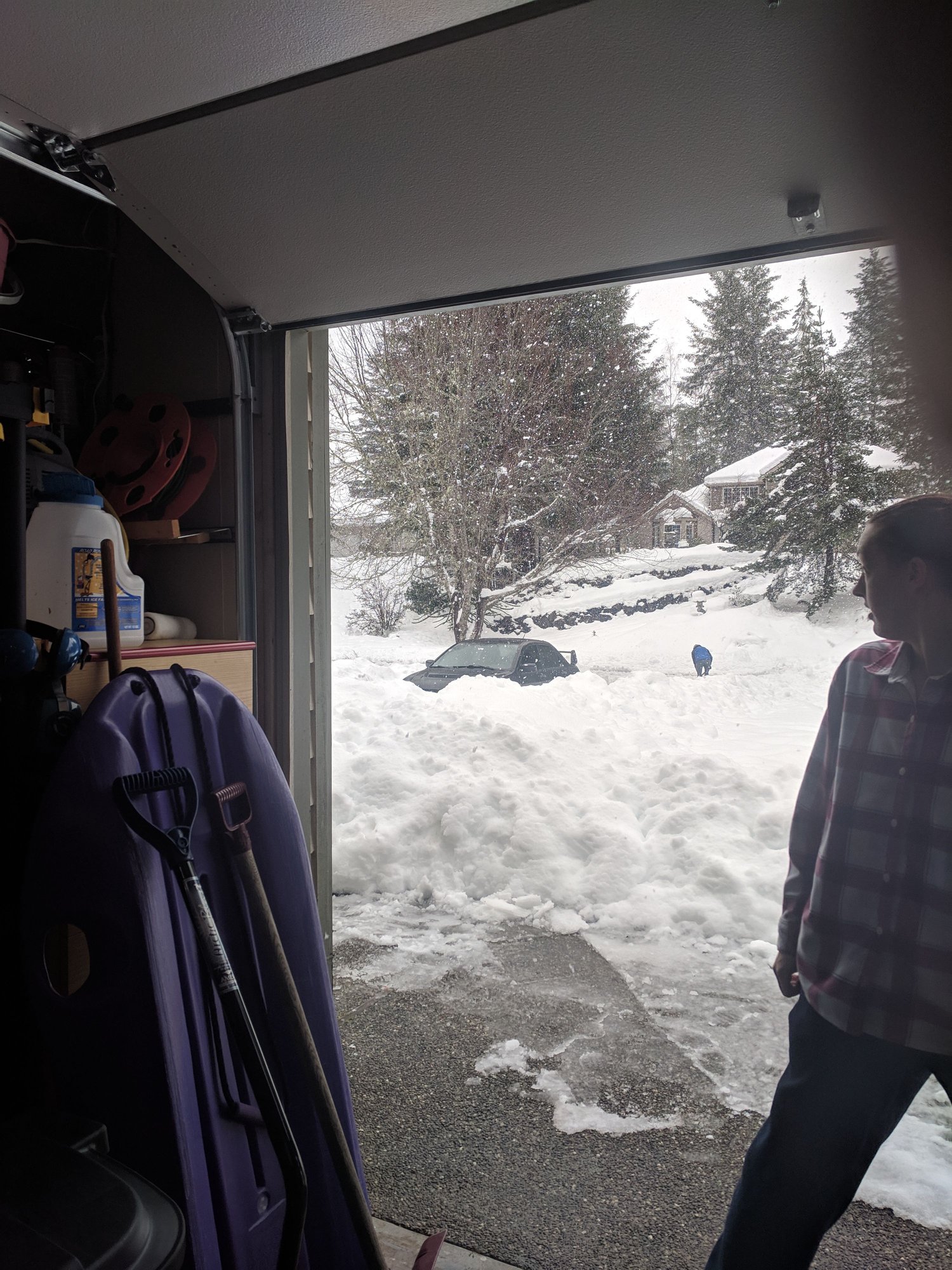 To continue on with the saga, Isabelle decided to give up the ghost on the factory oil cooler. We had a TON of snow this winter (see pics below), and I think the oil cooler got damaged during the Snowpocalypse. With this in mind, I had ordered a new Mishimoto oil cooler to replace it during the next oil change. The week before I was aiming to go the change, the cooler finally finished bursting and spewed all my oil out in a Jack in the Box parking lot. Fortunately for me, the drive-thru lady pointed out that "I might be leaking something," and that I should check it. I did, expecting a small little stream of something. NOPE, all the oil was everywhere. I immediately shut off the car, and went into a blended panic/fix-it mode. I am eternally grateful that I had a) shop towels, b) the new oil cooler, and c) the correct tools for the job, all in the car with me at this particular moment in time. So I was able to change it all out and get the new cooler in place before driving home. (There was a Walmart across the street, so I was able to grab new oil too, phew.) Got a free lunch out of the deal because the staff were all surprised I tackled things that quickly in their parking lot haha.