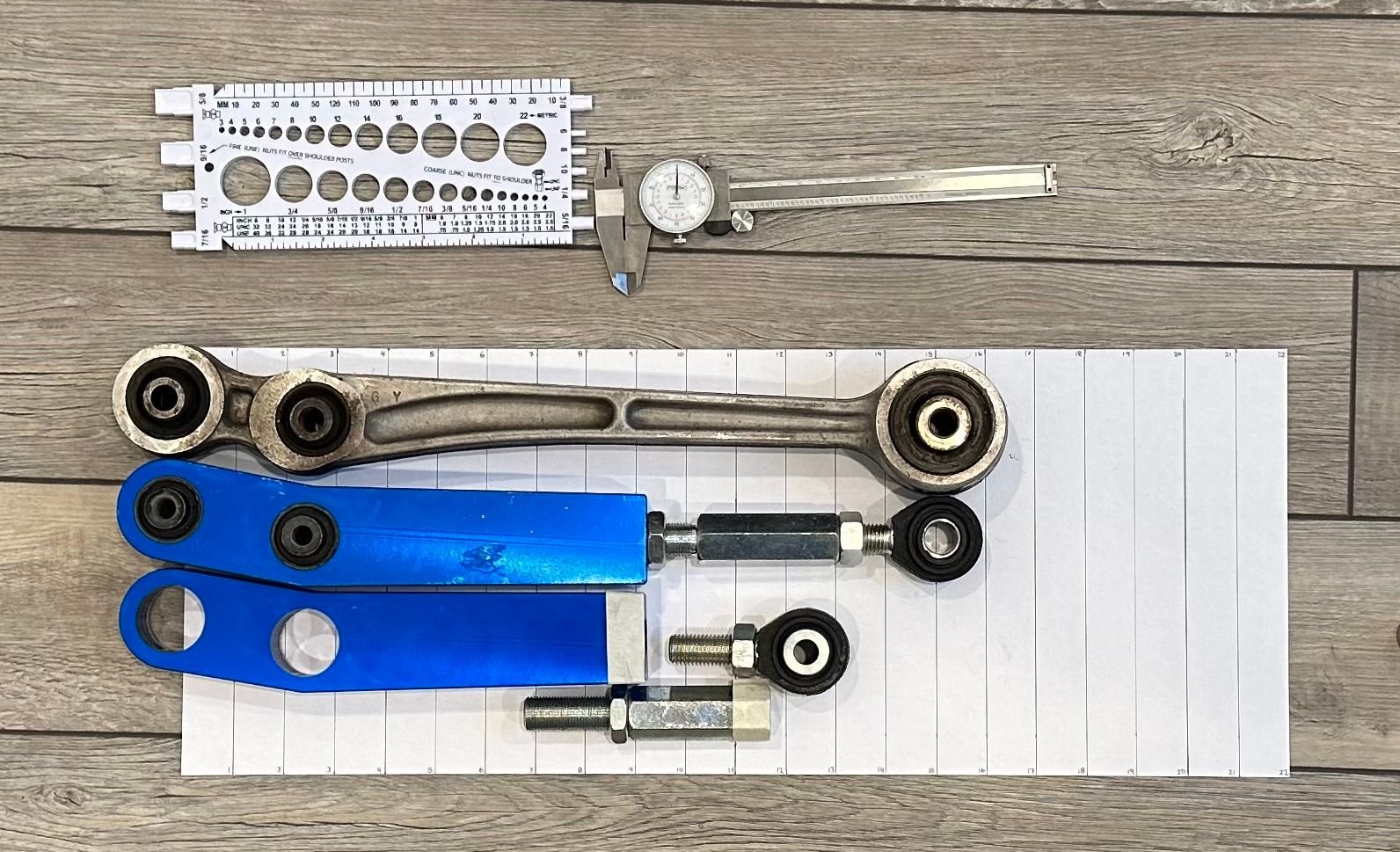 Here is a photo of the Oem control arm and eBay some cheap eBay ones . Essentially I will need to modify the eBay control arm to be the length in the picture measured center of the putter bushing bolt hole to the camber bolt hole center . Oem is about 15 inches and my goal is to modify it down to 12.5” inches. I can cut off 3/4 “ from the two areas covered in tape and it should be sufficient to have enough threaded in to not still hold strong .