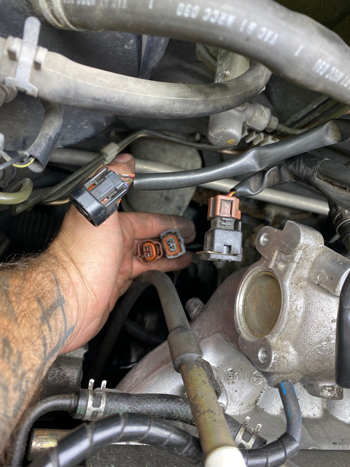 Wiring is all hooked up but I can’t find where two plugs go. Looking at The top two plugs, the one on the right I can’t figure out and the ones I’m holding , it’s the plug on the right also. They are the exact same plug but one is above the intake and one is below it
