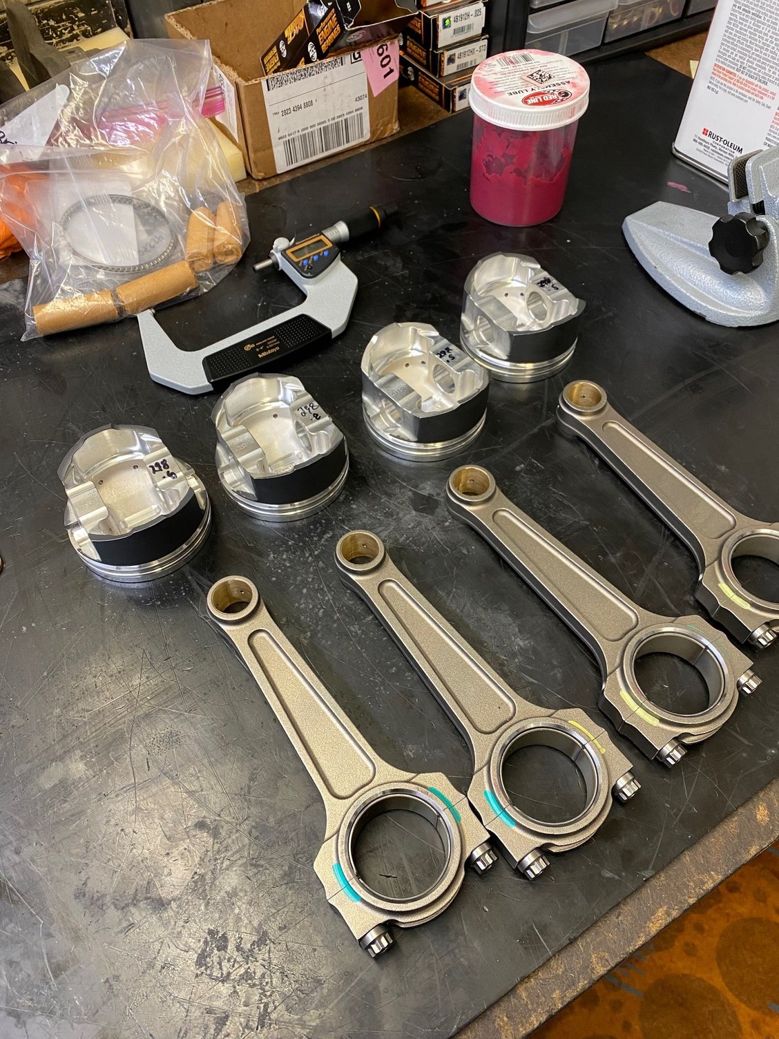 Standard rod 2.4 Manley turbo tuff rods Weisco Hd 12.5:1 pistons Swain tech coated Oem mitsu crank rebuilt oil pump gears that are polished Swain tech coated bearings Cosworth hg Torque solutions motor mounts