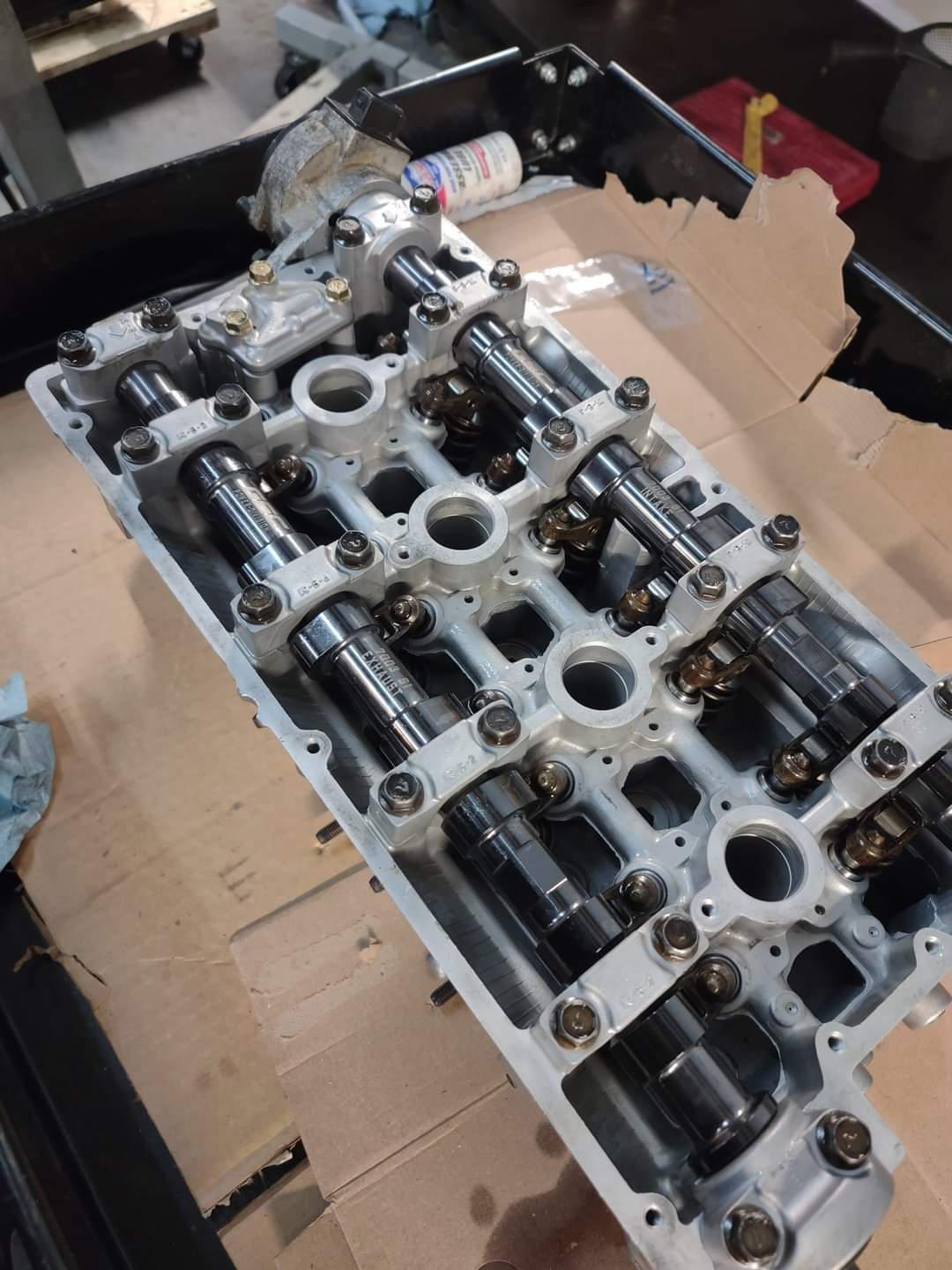 Head is getting cleaned, resurfaced and valves seated at a machine shop.