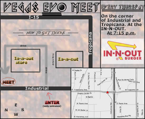 Head down to the In-N-Out Burger on Tropicana and Industrial (Right on the other side of the I-15 freeway behind the new York New York hotel. There is an Evo/Subi meet on Thursday nights at about 8:00. Plus In-N-Out is legendary here in the west and So. Cal. You have to try one if you are not vegan.