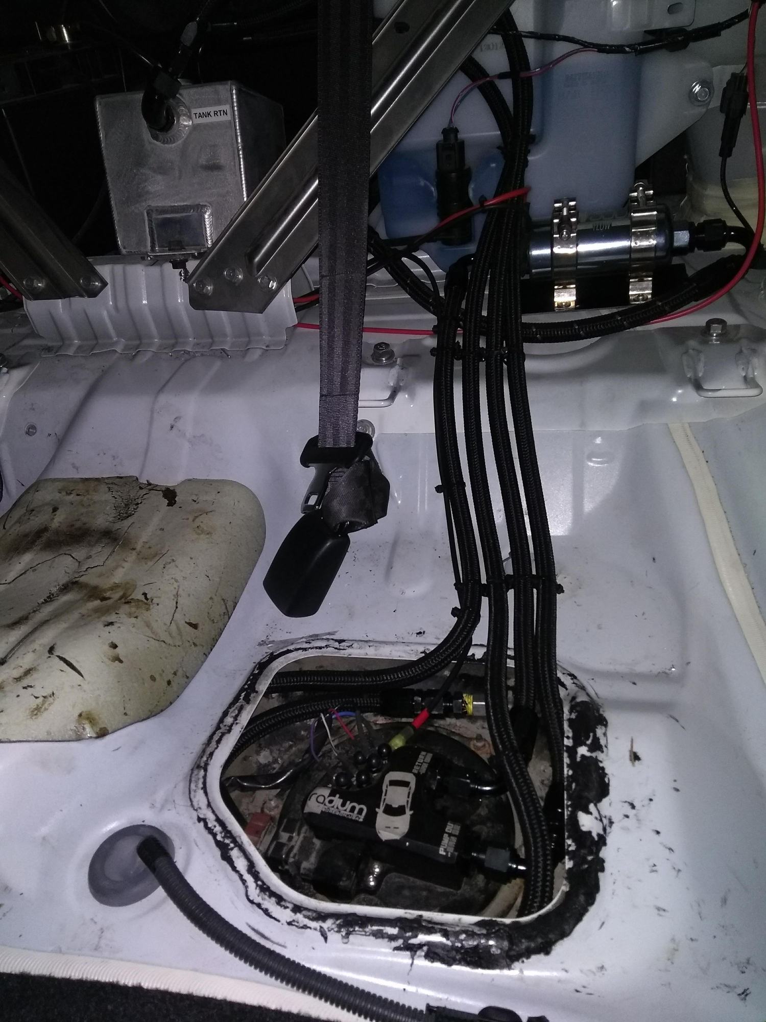 these hoses ended up slightly bunched closer once the lid was on. Notice ONE wire from tank pump going to relay.
