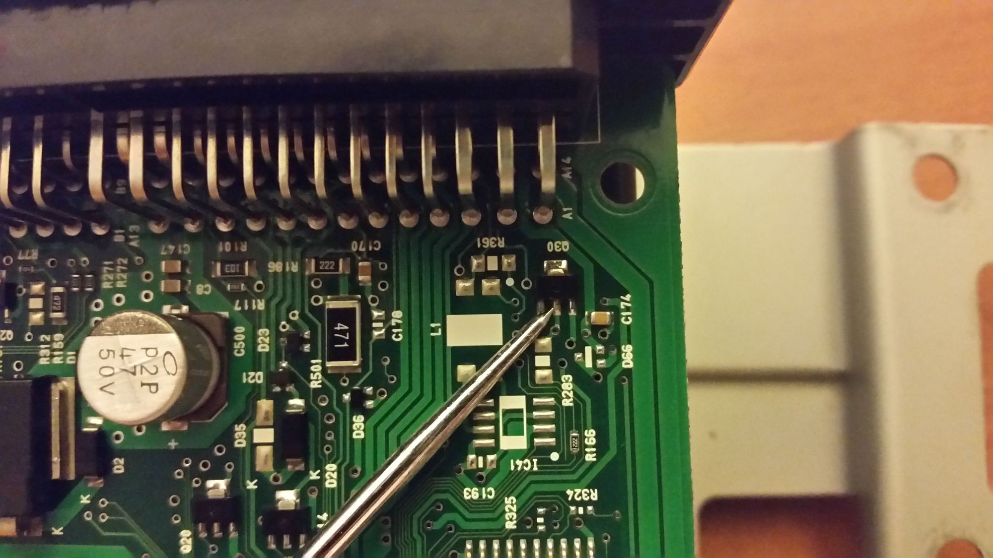 Transistor 1 in circuit from pin 22. Test good, center pin to back center lead.