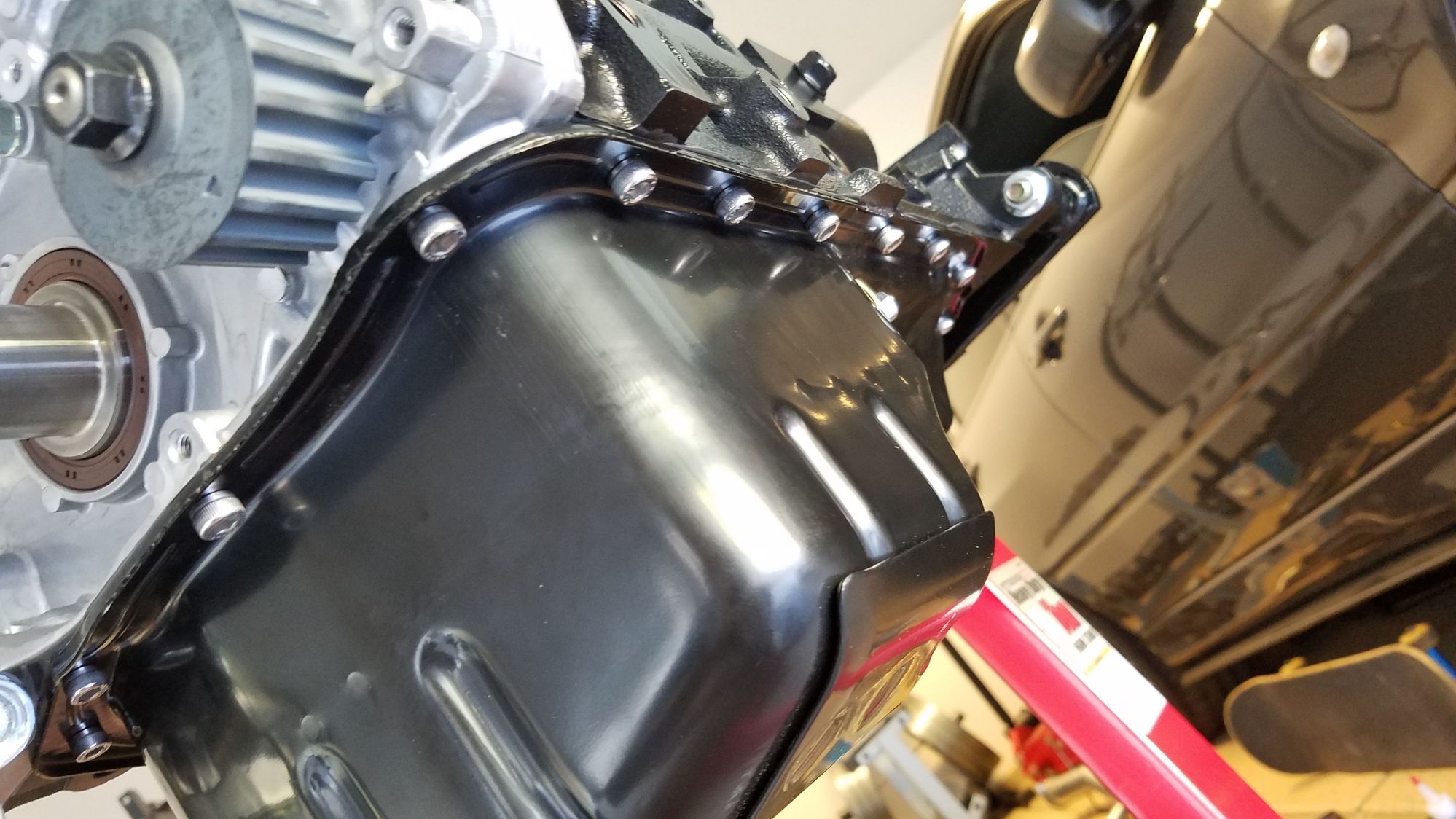 Secured the oil pan following the RTV instruction on the tube. I used STM's oil pan allen bolts for a clean look. My old oil pan bolts look like crap.
