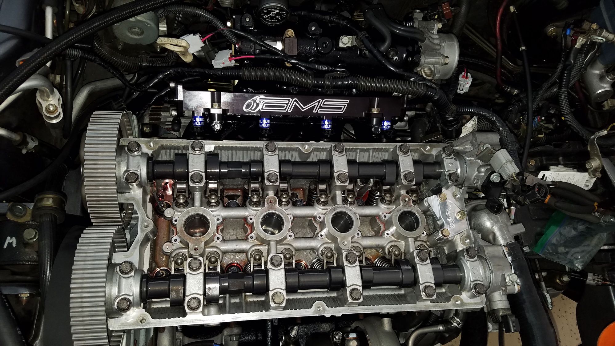 Cam Gears installed and torqued to spec. FIC 2150cc injectors inserted into manifold with AMS fuel rail.