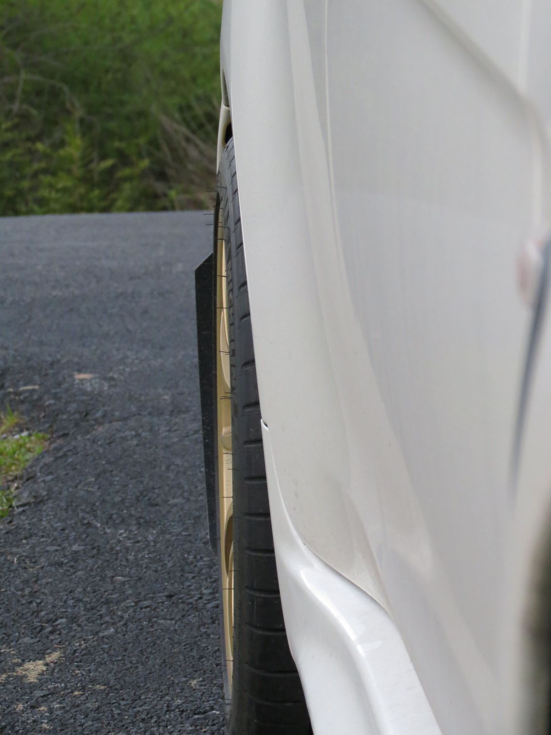 passenger side, point from front of car to rear to show the *poke* of rear tire.. just about flush.